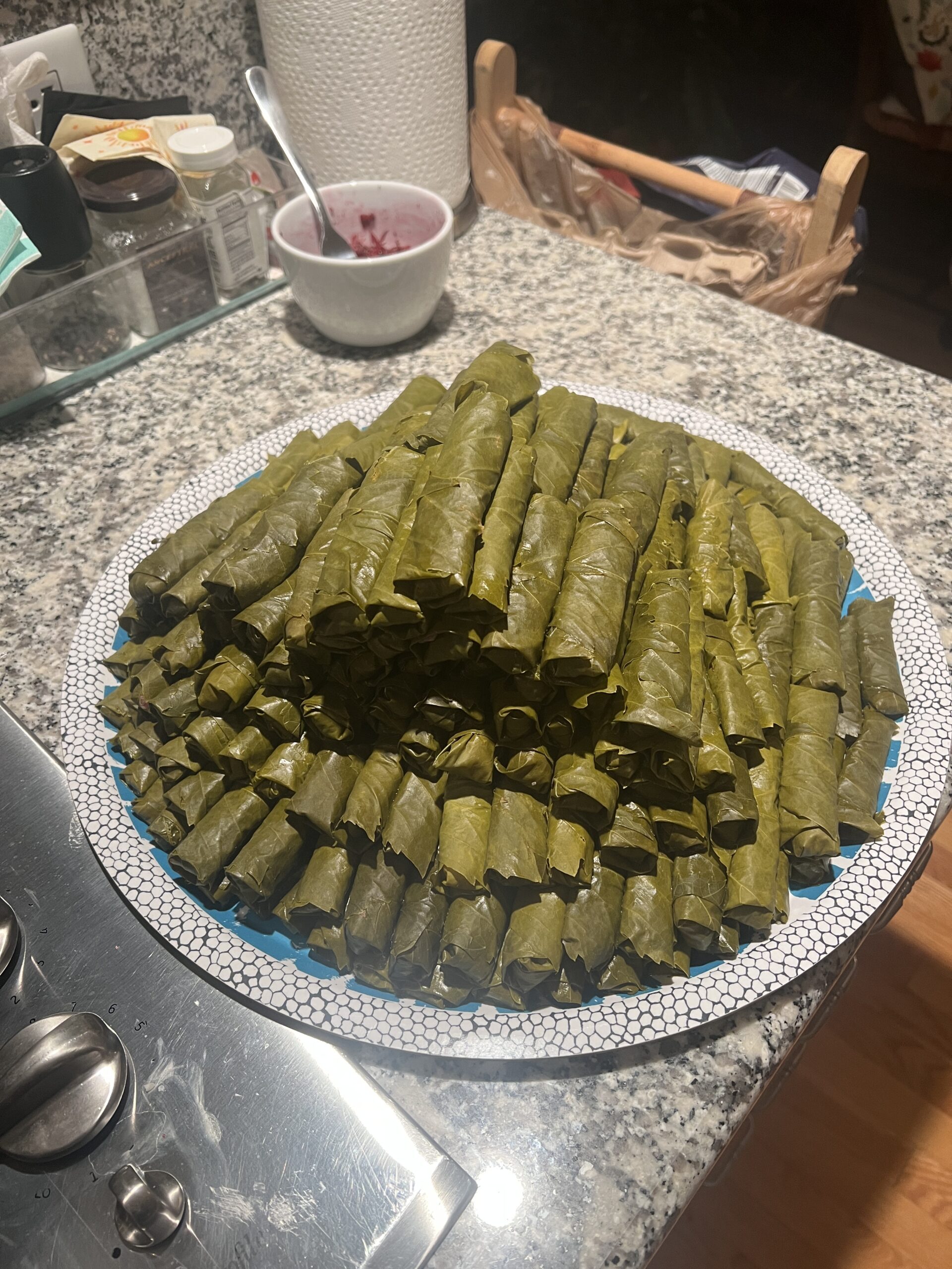 Can you tell I was very proud of this mountain of warak arish (warak enab/grape leaves)?? I love cooking so I usually cook like I’m in a family of 5. I happily end up with meals for months:) This version is made with ground beef and rice.